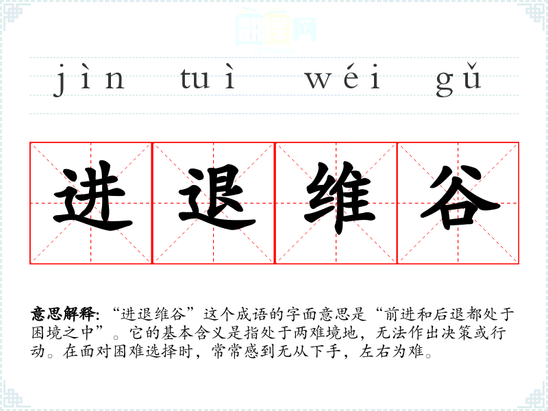 “进退维谷”这个成语的字面意思是“前进和后退都处于困境之中”。它的基本含义是指处于两难境地,无法作出决策或行动。在面对困难选择时,常常感到无从下手,左右为难。