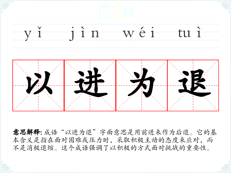 成语“以进为退”字面意思是用前进来作为后退。它的基本含义是指在面对困难或压力时,采取积极主动的态度来应对,而不是消极退缩。这个成语强调了以积极的方式面对挑战的重要性。
