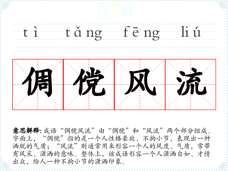 成语“倜傥风流”由“倜傥”和“风流”两个部分组成。字面上,“倜傥”指的是一个人性格豪放、不拘小节,表现出一种洒脱的气质;“风流”则通常用来形容一个人的风度、气质,常带有风采、潇洒的意味。整体上,该成语形容一个人潇洒自如、才情出众,给人一种不拘小节的潇洒印象。