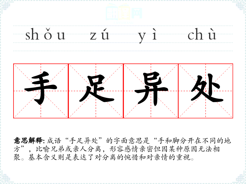 成语“手足异处”的字面意思是“手和脚分开在不同的地方”,比喻兄弟或亲人分离,形容感情亲密但因某种原因无法相聚。基本含义则是表达了对分离的惋惜和对亲情的重视。