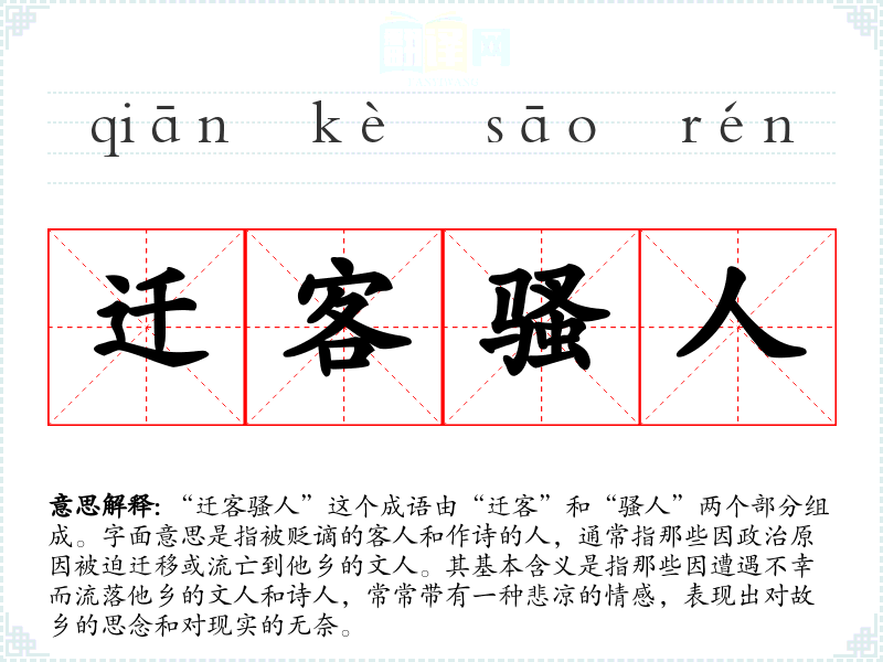 “迁客骚人”这个成语由“迁客”和“骚人”两个部分组成。字面意思是指被贬谪的客人和作诗的人,通常指那些因政治原因被迫迁移或流亡到他乡的文人。其基本含义是指那些因遭遇不幸而流落他乡的文人和诗人,常常带有一种悲凉的情感,表现出对故乡的思念和对现实的无奈。