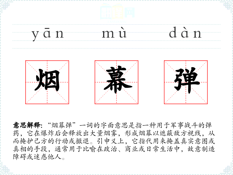“烟幕弹”这个词源于军事术语,尤其是在近代战争中。虽然它并非传统意义上的成语,但在现代汉语中被广泛使用,尤其是在描述复杂的社会现象、政治策略或商业竞争时。它反映了现代社会中信息战和认知战的特点,强调了表象与真实之间的差距。