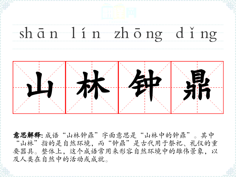 成语“山林钟鼎”字面意思是“山林中的钟鼎”。其中“山林”指的是自然环境,而“钟鼎”是古代用于祭祀、礼仪的重要器具。整体上,这个成语常用来形容自然环境中的雄伟景象,以及人类在自然中的活动或成就。