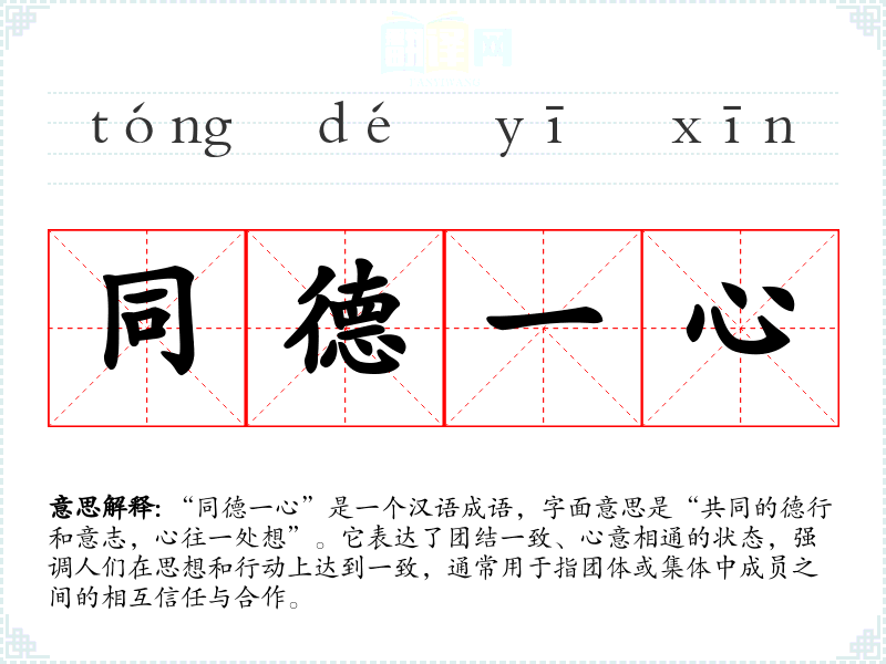 - 文学作品:在古典文学和现代小说中,“同德一心”常被用来描绘团体的凝聚力,如描写英雄团队、家族或团体共同面对困难时的团结精神。