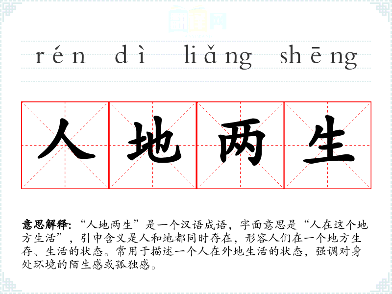 “人地两生”是一个汉语成语,字面意思是“人在这个地方生活”,引申含义是人和地都同时存在,形容人们在一个地方生存、生活的状态。常用于描述一个人在外地生活的状态,强调对身处环境的陌生感或孤独感。