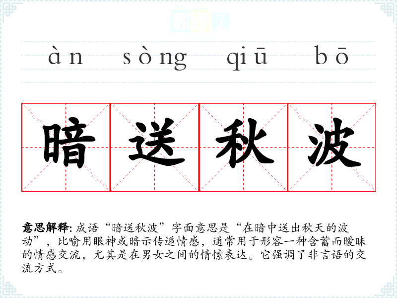 成语“暗送秋波”字面意思是“在暗中送出秋天的波动”,比喻用眼神或暗示传递情感,通常用于形容一种含蓄而暧昧的情感交流,尤其是在男女之间的情愫表达。它强调了非言语的交流方式。