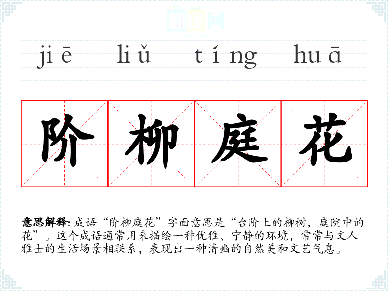 成语“阶柳庭花”字面意思是“台阶上的柳树,庭院中的花”。这个成语通常用来描绘一种优雅、宁静的环境,常常与文人雅士的生活场景相联系,表现出一种清幽的自然美和文艺气息。