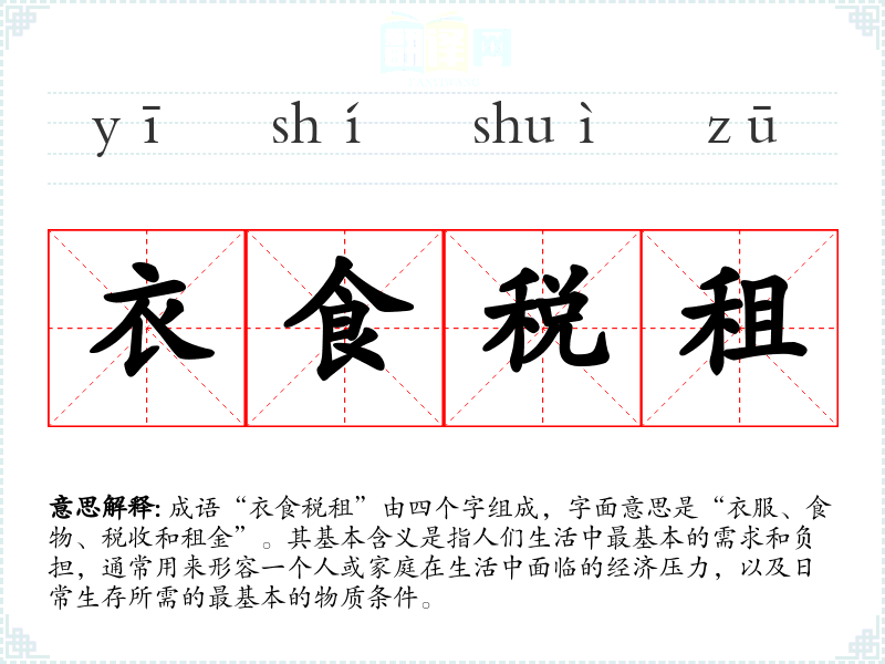 成语“衣食税租”由四个字组成,字面意思是“衣服、食物、税收和租金”。其基本含义是指人们生活中最基本的需求和负担,通常用来形容一个人或家庭在生活中面临的经济压力,以及日常生存所需的最基本的物质条件。