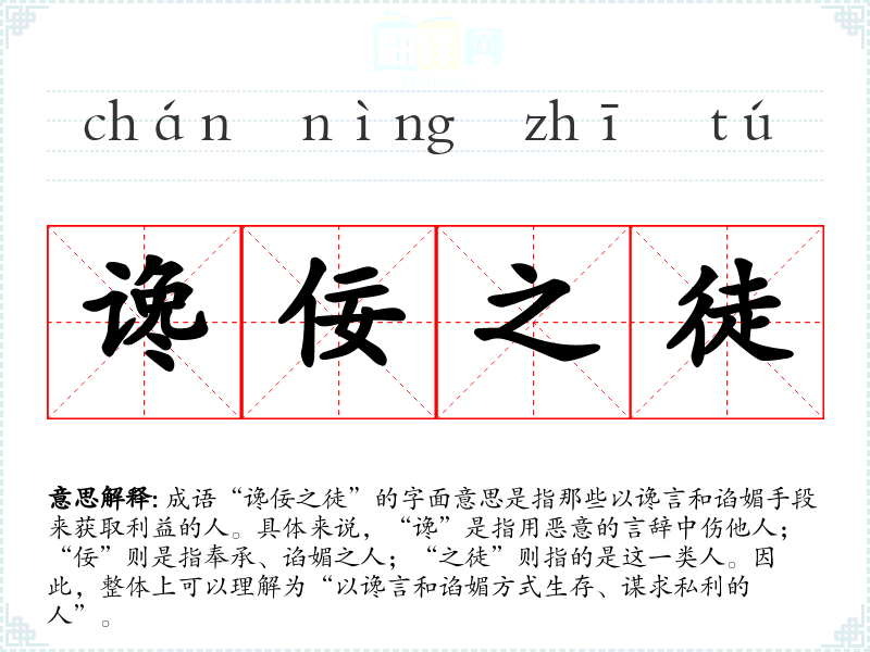 成语“谗佞之徒”的字面意思是指那些以谗言和谄媚手段来获取利益的人。具体来说,“谗”是指用恶意的言辞中伤他人;“佞”则是指奉承、谄媚之人;“之徒”则指的是这一类人。因此,整体上可以理解为“以谗言和谄媚方式生存、谋求私利的人”。