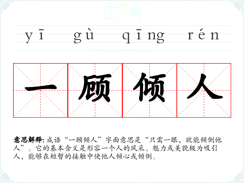 成语“一顾倾人”字面意思是“只需一眼,就能倾倒他人”。它的基本含义是形容一个人的风采、魅力或美貌极为吸引人,能够在短暂的接触中使他人倾心或倾倒。