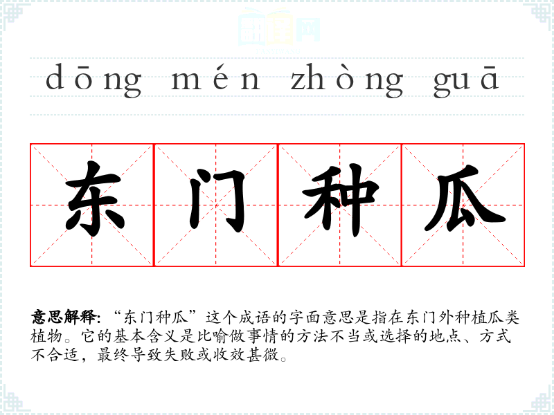 “东门种瓜”这个成语的字面意思是指在东门外种植瓜类植物。它的基本含义是比喻做事情的方法不当或选择的地点、方式不合适,最终导致失败或收效甚微。