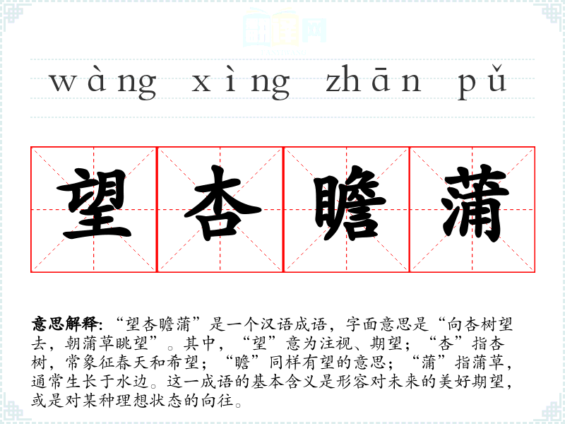 “望杏瞻蒲”是一个汉语成语,字面意思是“向杏树望去,朝蒲草眺望”。其中,“望”意为注视、期望;“杏”指杏树,常象征春天和希望;“瞻”同样有望的意思;“蒲”指蒲草,通常生长于水边。这一成语的基本含义是形容对未来的美好期望,或是对某种理想状态的向往。