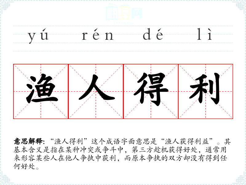 “渔人得利”这个成语字面意思是“渔人获得利益”。其基本含义是指在某种冲突或争斗中,第三方趁机获得好处,通常用来形容某些人在他人争执中获利,而原本争执的双方却没有得到任何好处。