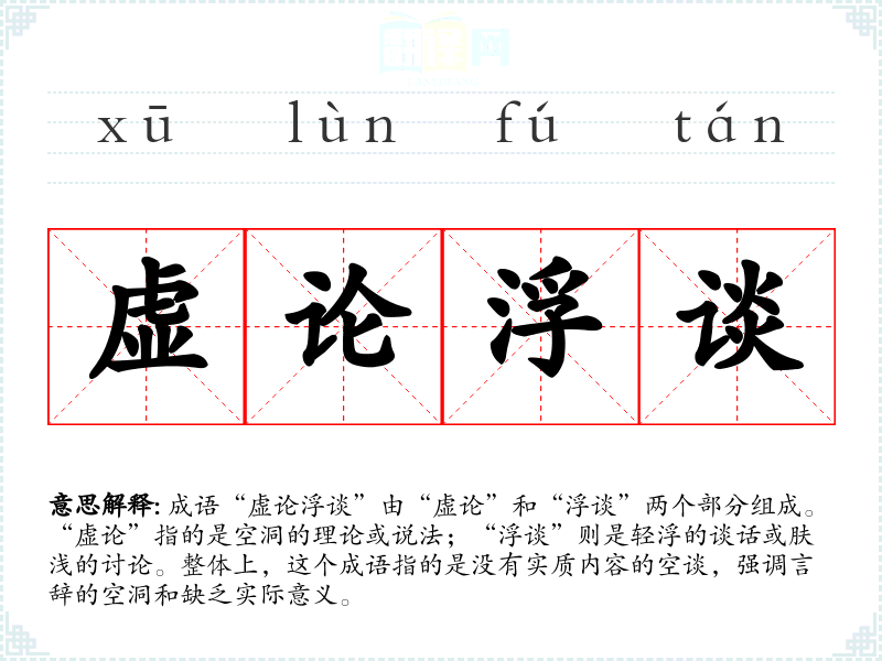 成语“虚论浮谈”由“虚论”和“浮谈”两个部分组成。“虚论”指的是空洞的理论或说法;“浮谈”则是轻浮的谈话或肤浅的讨论。整体上,这个成语指的是没有实质内容的空谈,强调言辞的空洞和缺乏实际意义。