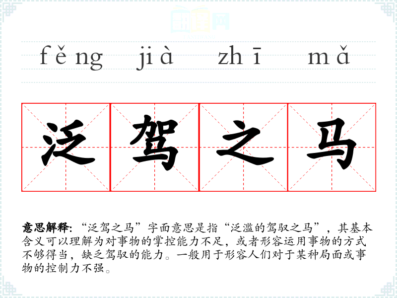 “泛驾之马”字面意思是指“泛滥的驾驭之马”,其基本含义可以理解为对事物的掌控能力不足,或者形容运用事物的方式不够得当,缺乏驾驭的能力。一般用于形容人们对于某种局面或事物的控制力不强。