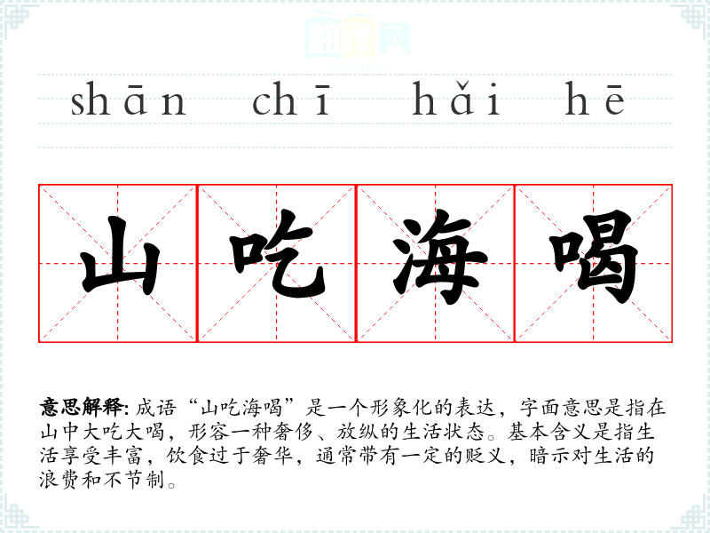 成语“山吃海喝”是一个形象化的表达,字面意思是指在山中大吃大喝,形容一种奢侈、放纵的生活状态。基本含义是指生活享受丰富,饮食过于奢华,通常带有一定的贬义,暗示对生活的浪费和不节制。