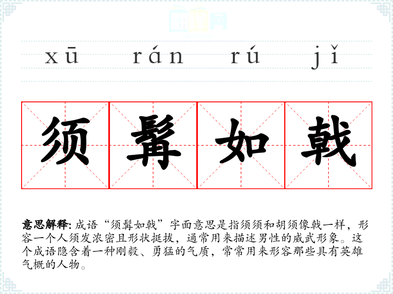 成语“须髯如戟”字面意思是指须须和胡须像戟一样,形容一个人须发浓密且形状挺拔,通常用来描述男性的威武形象。这个成语隐含着一种刚毅、勇猛的气质,常常用来形容那些具有英雄气概的人物。