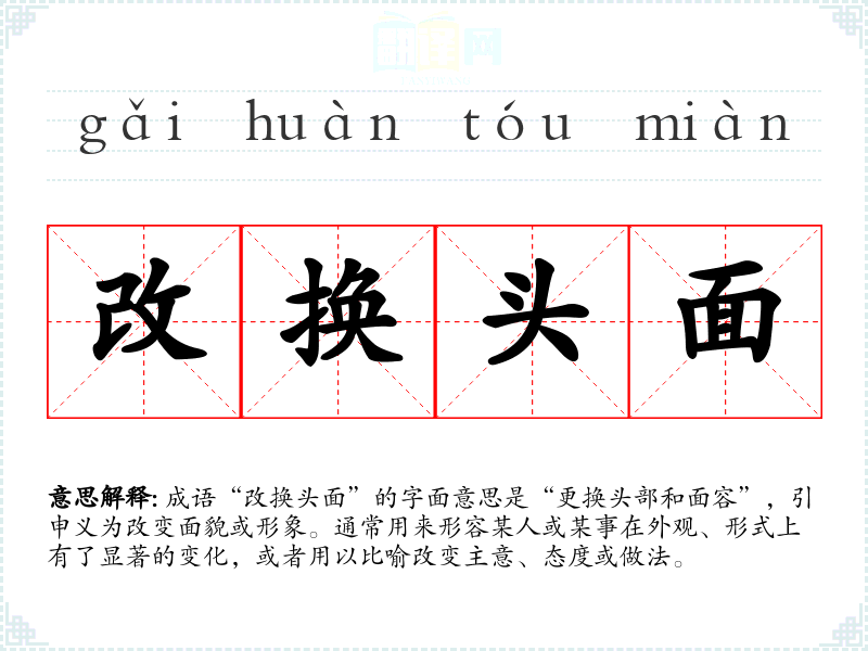 成语“改换头面”的字面意思是“更换头部和面容”,引申义为改变面貌或形象。通常用来形容某人或某事在外观、形式上有了显著的变化,或者用以比喻改变主意、态度或做法。