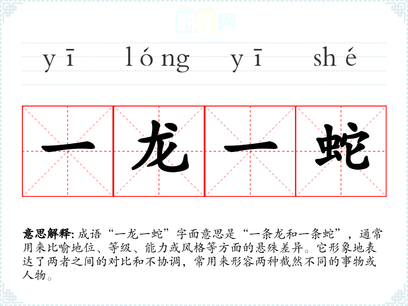 “一龙一蛇”最早见于古代文献,具体出处不详,但该成语的使用可以追溯到对自然界的观察和对比。龙在中国文化中象征着权威、尊贵和力量,而蛇则通常与阴险、狡诈和低贱联系在一起。因此,这个成语在历史上常被用来描述两种相对极端的情况。