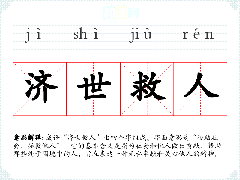 成语“济世救人”由四个字组成。字面意思是“帮助社会,拯救他人”。它的基本含义是指为社会和他人做出贡献,帮助那些处于困境中的人,旨在表达一种无私奉献和关心他人的精神。
