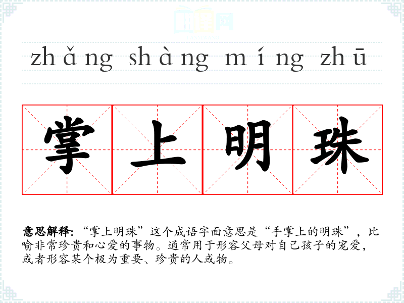 “掌上明珠”这个成语字面意思是“手掌上的明珠”,比喻非常珍贵和心爱的事物。通常用于形容父母对自己孩子的宠爱,或者形容某个极为重要、珍贵的人或物。
