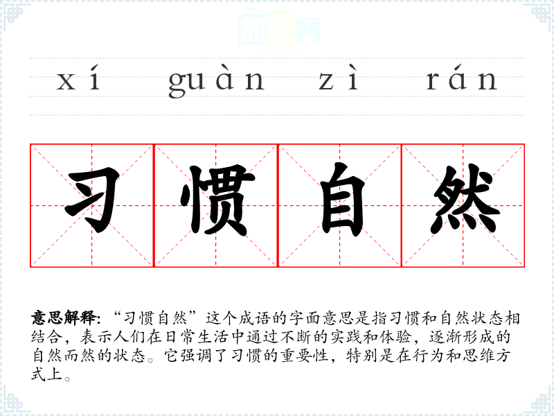“惯自然”这个成语的字面意思是指惯和自然状态相结合,表示人们在日常生活中通过不断的实践和体验,逐渐形成的自然而然的状态。它强调了*惯的重要性,特别是在行为和思维方式上。