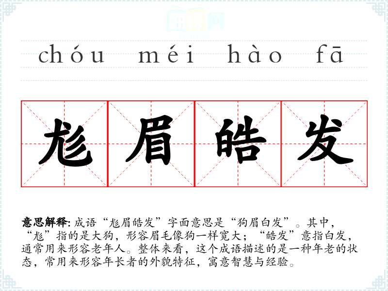 成语“尨眉皓发”字面意思是“狗眉白发”。其中,“尨”指的是大狗,形容眉毛像狗一样宽大;“皓发”意指白发,通常用来形容老年人。整体来看,这个成语描述的是一种年老的状态,常用来形容年**的外貌特征,寓意智慧与经验。