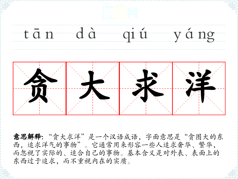 “贪大求洋”是一个汉语成语,字面意思是“贪图大的东西,追求洋气的事物”。它通常用来形容一些人追求奢华、繁华,而忽视了实际的、适合自己的事物。基本含义是对外表、表面上的东西过于追求,而不重视内在的实质。