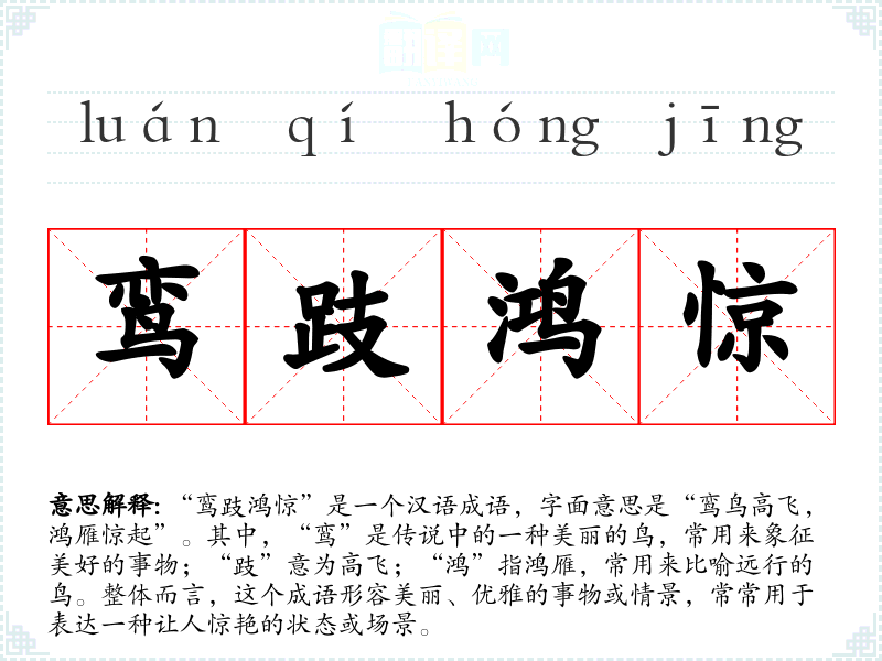 “鸾跂鸿惊”最早出现在《诗经》中,体现了古代人们对美好事物的向往与赞美。该成语常用来形容美丽的女子或优雅的事物。其具体的历史背景与典故并不详尽,但可以推测与古代文化中对鸟类的崇敬和仰慕有密切关系。