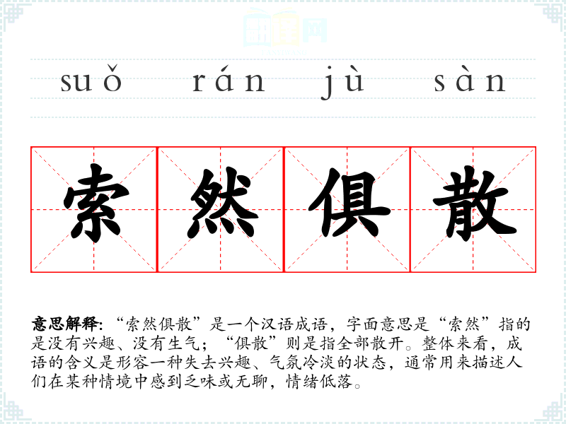 “索然俱散”是一个汉语成语,字面意思是“索然”指的是没有兴趣、没有生气;“俱散”则是指全部散开。整体来看,成语的含义是形容一种失去兴趣、气氛冷淡的状态,通常用来描述人们在某种情境中感到乏味或无聊,情绪低落。