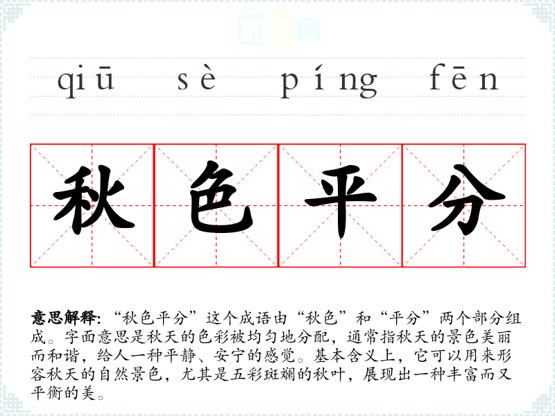 通过对“秋色平分”的学,我对这个成语的理解更加深入。它不仅仅是对秋季景色的描绘,更是一种对生活的哲学思考,提醒我们去欣赏生活中的美好与和谐。在语言学和表达中,这样的成语能够丰富我们的表达方式,让我们的语言更具表现力。