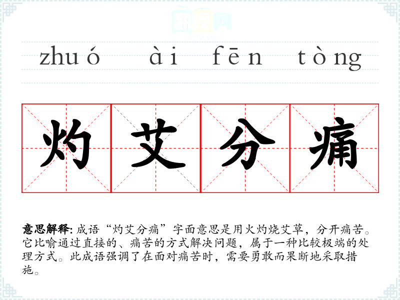 “灼艾分痛”给人一种坚韧和勇敢的感觉,联想到面对生活中的困难时需要有勇气和毅力。它激励人们在逆境中保持积极态度,尽管可能需要忍受短期的不适。