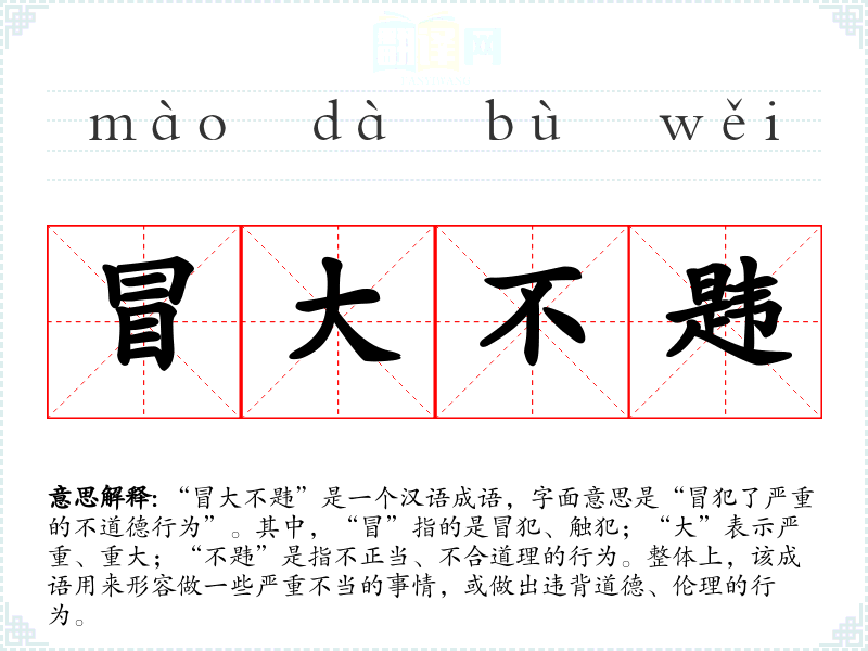 “冒大不韪”是一个汉语成语,字面意思是“冒犯了严重的不道德行为”。其中,“冒”指的是冒犯、触犯;“大”表示严重、重大;“不韪”是指不正当、不合道理的行为。整体上,该成语用来形容做一些严重不当的事情,或做出违背道德、伦理的行为。