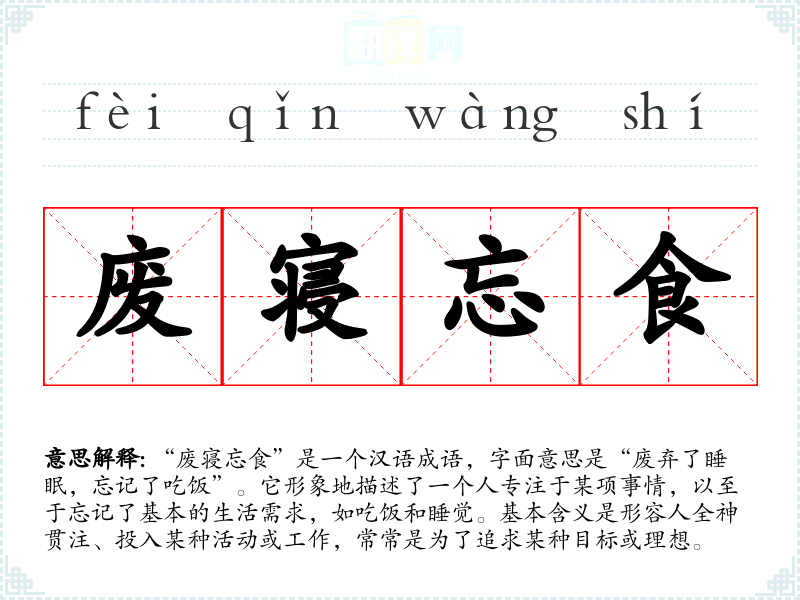 | 废寝忘餐 | 忘记了睡觉,顾不得吃饭。形容对某事专心致志或忘我地工作、学习。 |