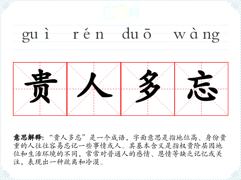“贵人多忘”是一个成语,字面意思是指地位高、身份贵重的人往往容易忘记一些事情或人。其基本含义是指权贵阶层因地位和生活环境的不同,常常对普通人的感情、恩情等缺乏记忆或关注,表现出一种疏离和冷漠。