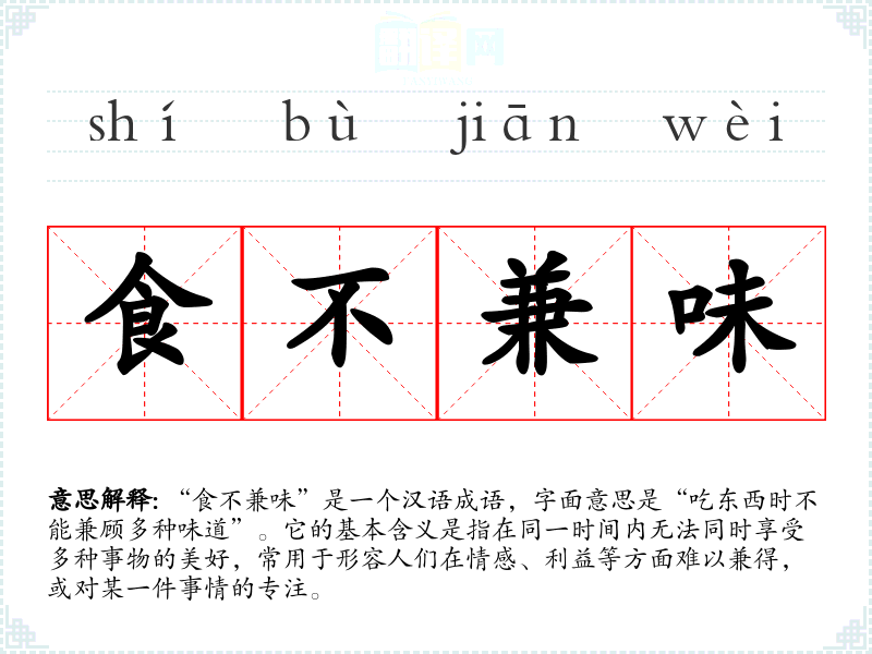 “食不兼味”是一个汉语成语,字面意思是“吃东西时不能兼顾多种味道”。它的基本含义是指在同一时间内无法同时享受多种事物的美好,常用于形容人们在情感、利益等方面难以兼得,或对某一件事情的专注。