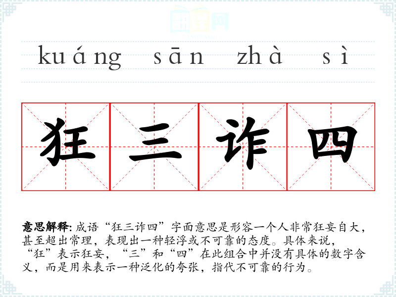 成语“狂三诈四”字面意思是形容一个人非常狂妄自大,甚至超出常理,表现出一种轻浮或不可靠的态度。具体来说,“狂”表示狂妄,“三”和“四”在此组合中并没有具体的数字含义,而是用来表示一种泛化的夸张,指代不可靠的行为。