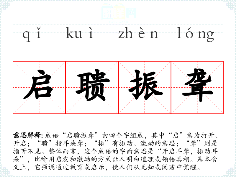 成语“启聩振聋”由四个字组成,其中“启”意为打开、开启;“聩”指耳朵聋;“振”有振动、激励的意思;“聋”则是指听不见。整体而言,这个成语的字面意思是“开启耳聋,振动耳朵”,比喻用启发和激励的方式让人明白道理或领悟真相。基本含义上,它强调通过教育或启示,使人们从无知或闭塞中觉醒。