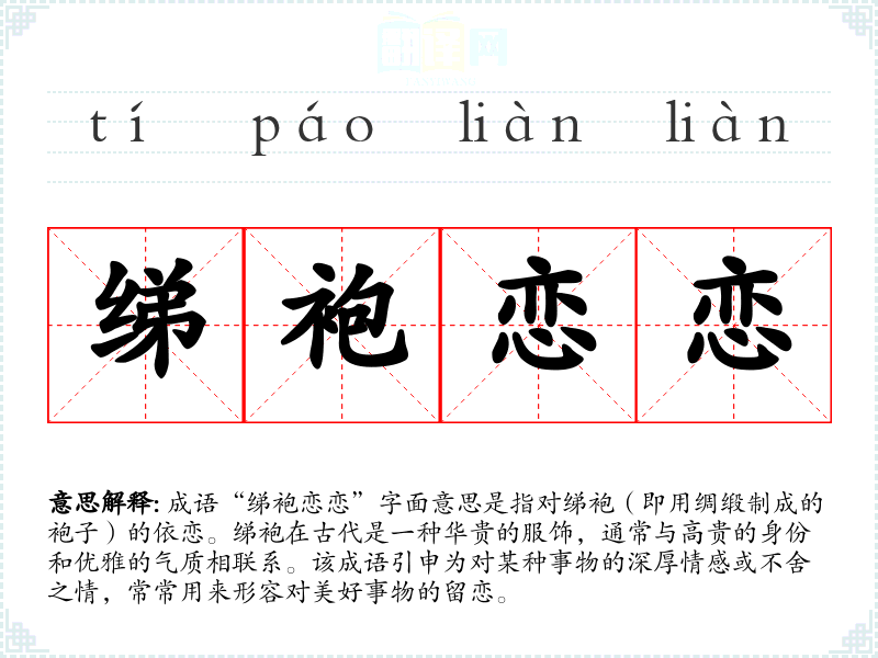 在**传统文化中,衣服不仅是遮体的工具,更是身份和地位的象征。绨袍作为一种华贵的服饰,常常与文人雅士的生活方式相联系。因此,成语“绨袍恋恋”也反映了对传统价值观的认同和对美好生活的向往。在现代社会,它依然适用于表达对美好事物的留恋。