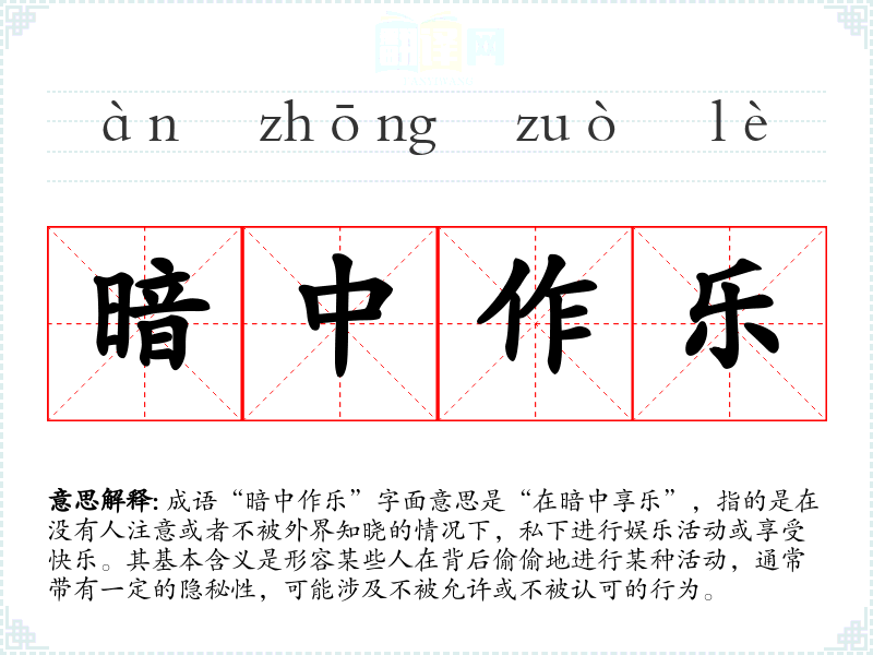 成语“暗中作乐”字面意思是“在暗中享乐”,指的是在没有人注意或者不被外界知晓的情况下,私下进行娱乐活动或享受快乐。其基本含义是形容某些人在背后偷偷地进行某种活动,通常带有一定的隐秘性,可能涉及不被允许或不被认可的行为。