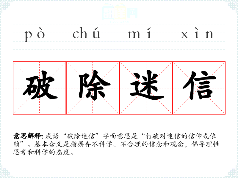 通过对“破除迷信”这个成语的学,我意识到它不仅是一种对待信仰的态度,更是科学精神的体现。在语言学和表达中,能够使用这样的成语,有助于增强论述的说服力和深度,也促使我在生活中更加注重理性思考和科学判断。