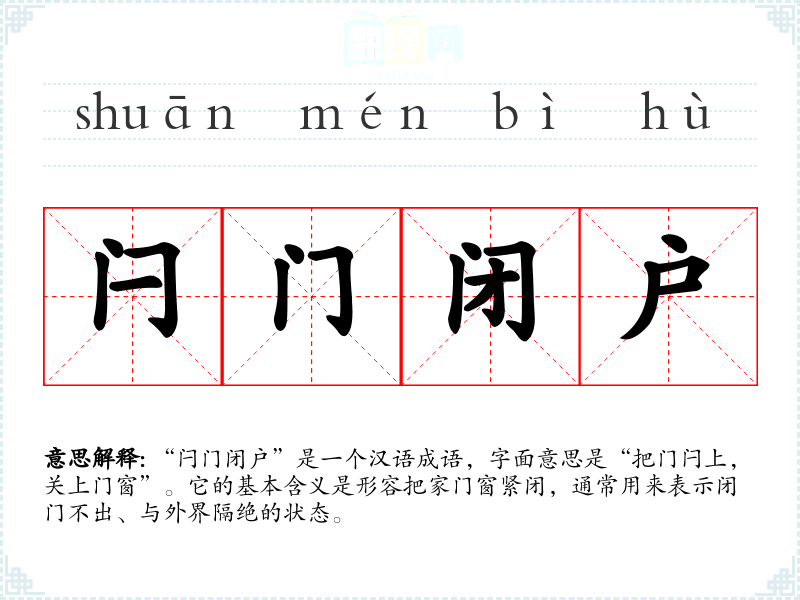 “闩门闭户”是一个汉语成语,字面意思是“把门闩上,关上门窗”。它的基本含义是形容把家门窗紧闭,通常用来表示闭门不出、与外界隔绝的状态。