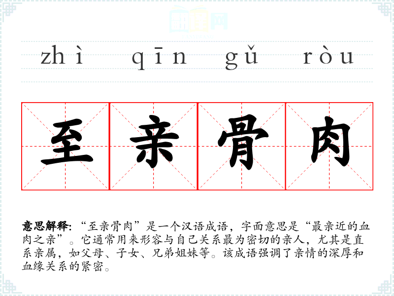 “至亲骨肉”是一个汉语成语,字面意思是“最亲近的血肉之亲”。它通常用来形容与自己关系最为密切的亲人,尤其是直系亲属,如父母、子女、兄弟姐妹等。该成语强调了亲情的深厚和血缘关系的紧密。