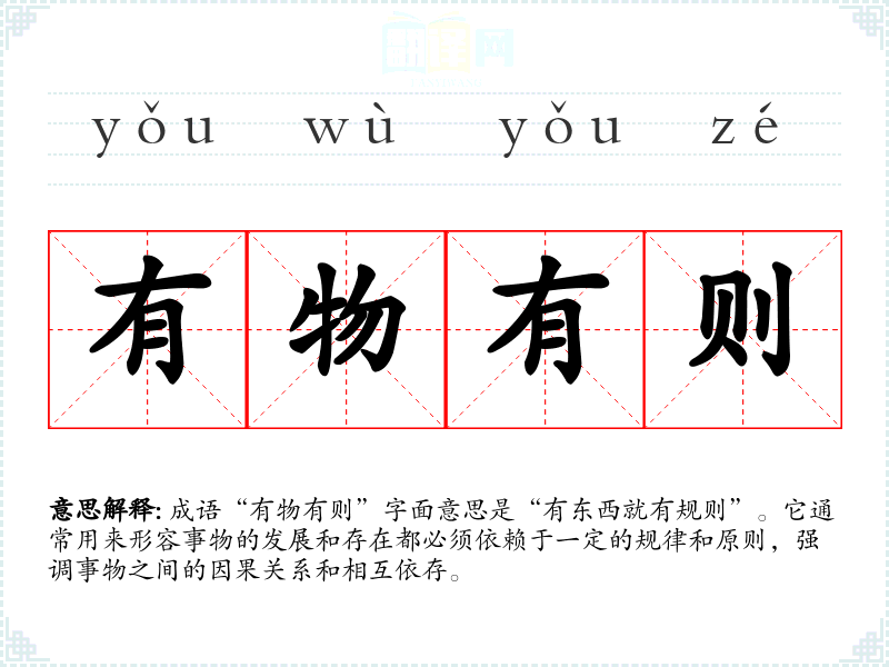 成语“有物有则”字面意思是“有东西就有规则”。它通常用来形容事物的发展和存在都必须依赖于一定的规律和原则,强调事物之间的因果关系和相互依存。