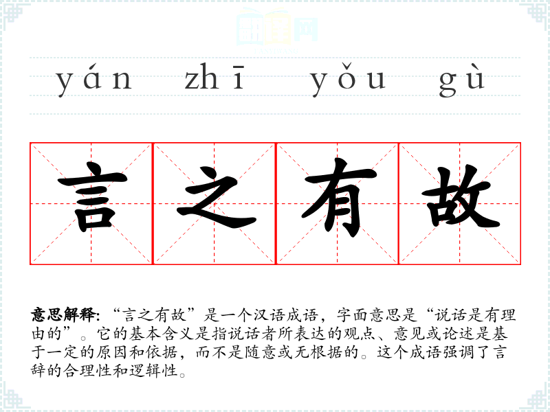 “言之有故”是一个汉语成语,字面意思是“说话是有理由的”。它的基本含义是指说话者所表达的观点、意见或论述是基于一定的原因和依据,而不是随意或无根据的。这个成语强调了言辞的合理性和逻辑性。