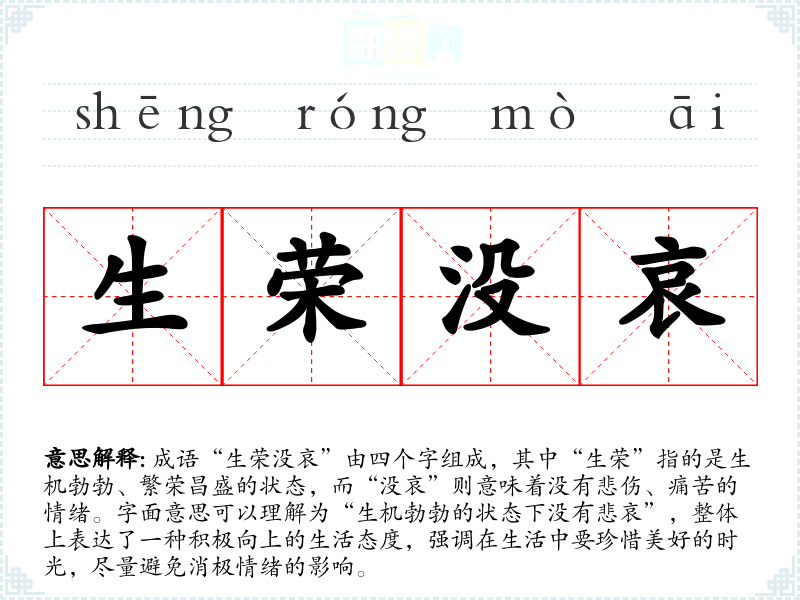 成语“生荣没哀”的确切历史背景和典故较为模糊,但可以推测与传统文化中的“乐观”思想密切相关。古代文人常常通过诗歌表达对生活的感悟,强调在繁荣与生机中保持乐观态度,避免沉溺于悲伤与痛苦。这一成语可能是从这一文化背景中演变而来。