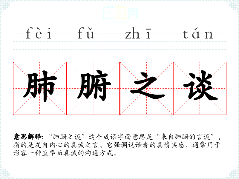 “肺腑之谈”这个成语字面意思是“来自肺腑的言谈”,指的是发自内心的真诚之言。它强调说话者的真情实感,通常用于形容一种直率而真诚的沟通方式。