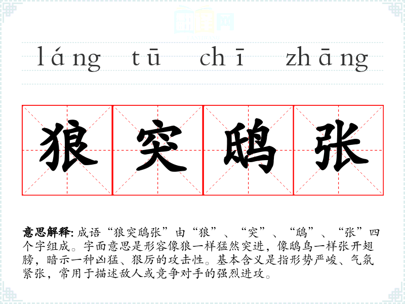成语“狼突鸱张”由“狼”、“突”、“鸱”、“张”四个字组成。字面意思是形容像狼一样猛然突进,像鸱鸟一样张开翅膀,暗示一种凶猛、狠厉的攻击性。基本含义是指形势严峻、气氛紧张,常用于描述敌人或竞争对手的强烈进攻。