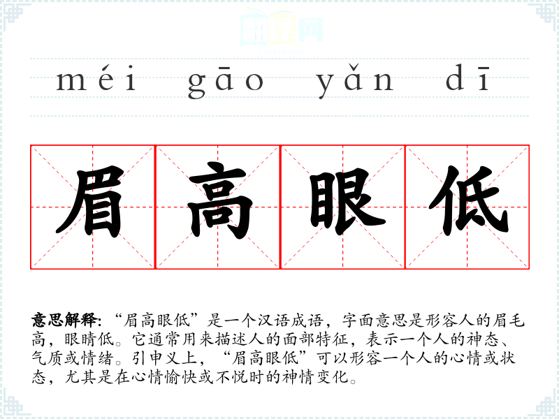 “眉高眼低”是一个汉语成语,字面意思是形容人的眉毛高,眼睛低。它通常用来描述人的面部特征,表示一个人的神态、气质或情绪。引申义上,“眉高眼低”可以形容一个人的心情或状态,尤其是在心情愉快或不悦时的神情变化。