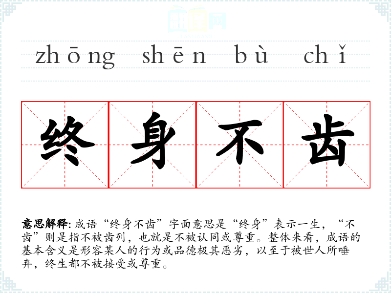 成语“终身不齿”字面意思是“终身”表示一生,“不齿”则是指不被齿列,也就是不被认同或尊重。整体来看,成语的基本含义是形容某人的行为或品德极其恶劣,以至于被世人所唾弃,终生都不被接受或尊重。